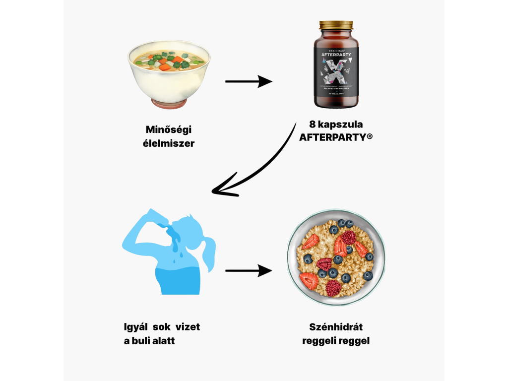 Az este előtt fogyasszon kiadós ételt. Evés közben fogyasszon 8 kapszula BRAINMAX AFTERPARTY®. Az este során igyon elegendő vizet, hogy csökkentse a kiszáradást. Reggel fogyasszon szénhidráttartalmú reggelit az alacsony vércukorszint miatt.