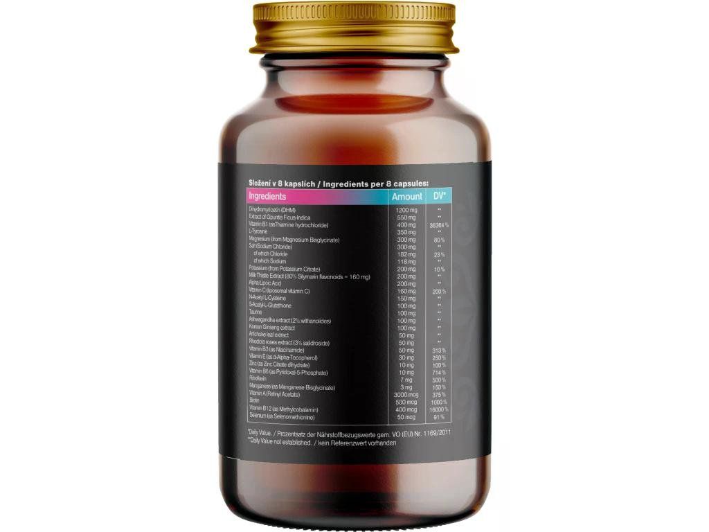 Összetevők: Dihydromyricetin, Opuntia ficus-indica kivonat, B1-vitamin (Tiamin-hidrokloridként), L-Tyrosin, magnézium (magnézium-biszglicinátból), só (nátrium-klorid), ebből klorid, ebből nátrium, kálium (kálium-citrátból), máriatövis kivonat (80% silymarinnal standardizálva), alfa-liponsav, C-vitamin (liposzomális C-vitamin), N-Acetyl-L-Cystein, S-Acetyl-L-Glutathion, taurin, ashwagandha kivonat (2% withanolides), koreai ginseng kivonat, articsóka levél kivonat, rózsagyökér kivonat, niacin (niacinamidként), E-vitamin (d-alfa-tokoferolként), cink (cink-citrát dihidrátként), B6-vitamin (piridoxal-5-foszfát) riboflavin, mangán (mangán-biszglicinátként), A-vitamin (retinil-acetátként), biotin (500 mcg, NRV 1000%), B12-vitamin (metilkobalaminként), szelén (szelenometioninként). Növényi kapszula HPMC alapon. Ballasztanyag mentes.