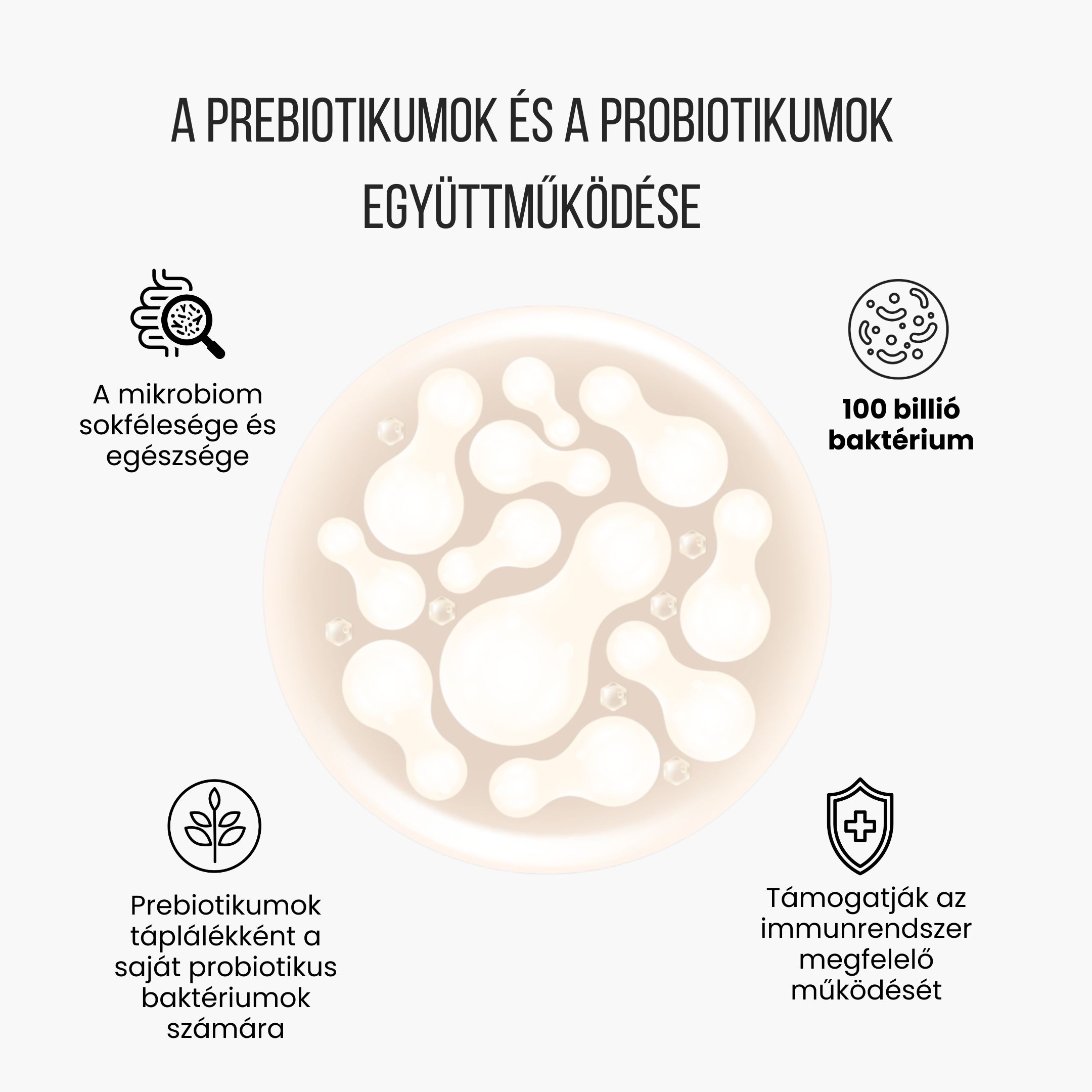 A bél egészsége nagyon szorosan összefügg a megfelelő rostbevitellel, mivel a rostok pozitívan befolyásolják a mikrobióma sokféleségét és egészségét . A prebiotikus rostok (prebiotikumok) táplálják a mikrobiomát. A probiotikus baktériumok (probiotikumok) maguk az egészségre jótékony baktériumok törzsei. A prebiotikumok tehát táplálékai saját probiotikus baktériumainknak, beleink lakóinak, akikkel szimbiotikus kapcsolatot alakítottunk ki több millió éves evolúció során. Segítenek az étrendünkből kapott tápanyagok megfelelő feldolgozásában, és egyben támogatják immunrendszerünk megfelelő működését.