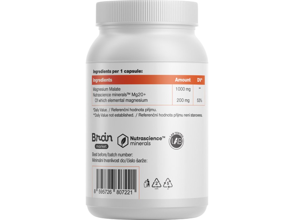 BrainMax Energy Magnesium®, 1000 mg, Magnézium-malát 200 mg, 100 kapszula Jól felszívódó szerves magnézium-malát 53% DV egy kapszulában Albion magnézium-malát étrend-kiegészítő