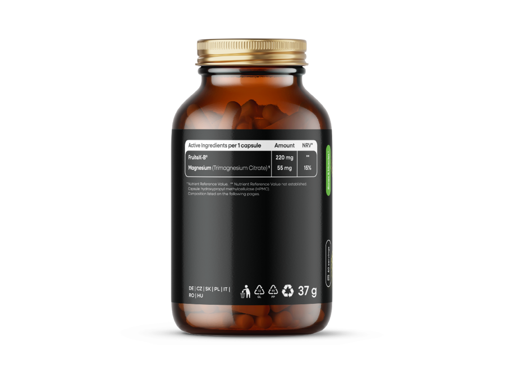 Összetevők 1 kapszulában: FruiteX-B® 220 mg**, Magnézium (magnézium-citrát) 55 mg (15%*), kapszula: hidroxipropil-metilcellulóz (HPMC).