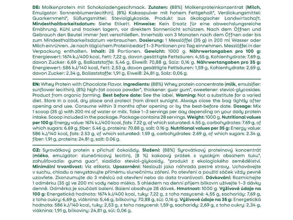 Összetevők: (88%) tejsavófehérje-koncentrátum (tej , emulgeálószer: napraforgó lecitin), (8%) magas zsírtartalmú kakaópor* , sűrítőanyag: guargumi*, édesítőszer: szteviol-glikozidok. *ökológiai gazdálkodásból származó termék.
