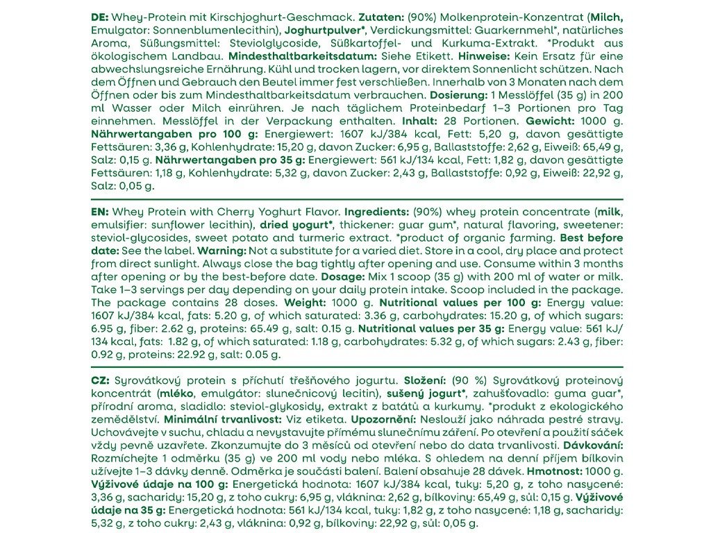 Összetevők: (90%) tejsavófehérje koncentrátum ( tej , emulgeálószer: napraforgó lecitin), szárított joghurt*, sűrítőanyag: guargumi*, természetes aroma, édesítőszer: szteviol-glikozidok, édesburgonya és kurkuma kivonat. *ökológiai gazdálkodásból származó termék.