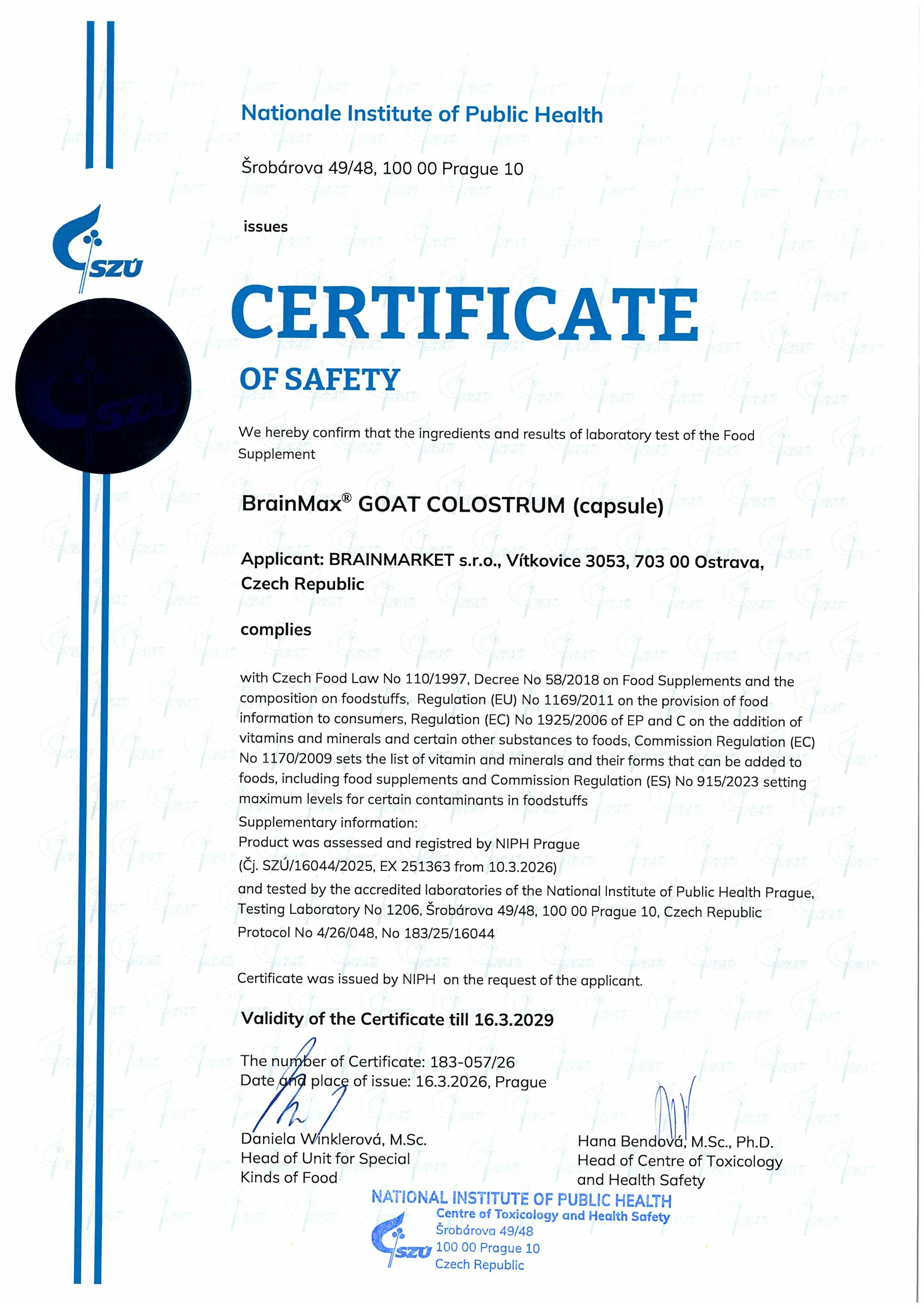 Összetevők: kecske kolosztrum, inulin. Tejet és laktózt tartalmaz. Csehországban gyártva a BRAINMARKET s.r.o. cég számára.