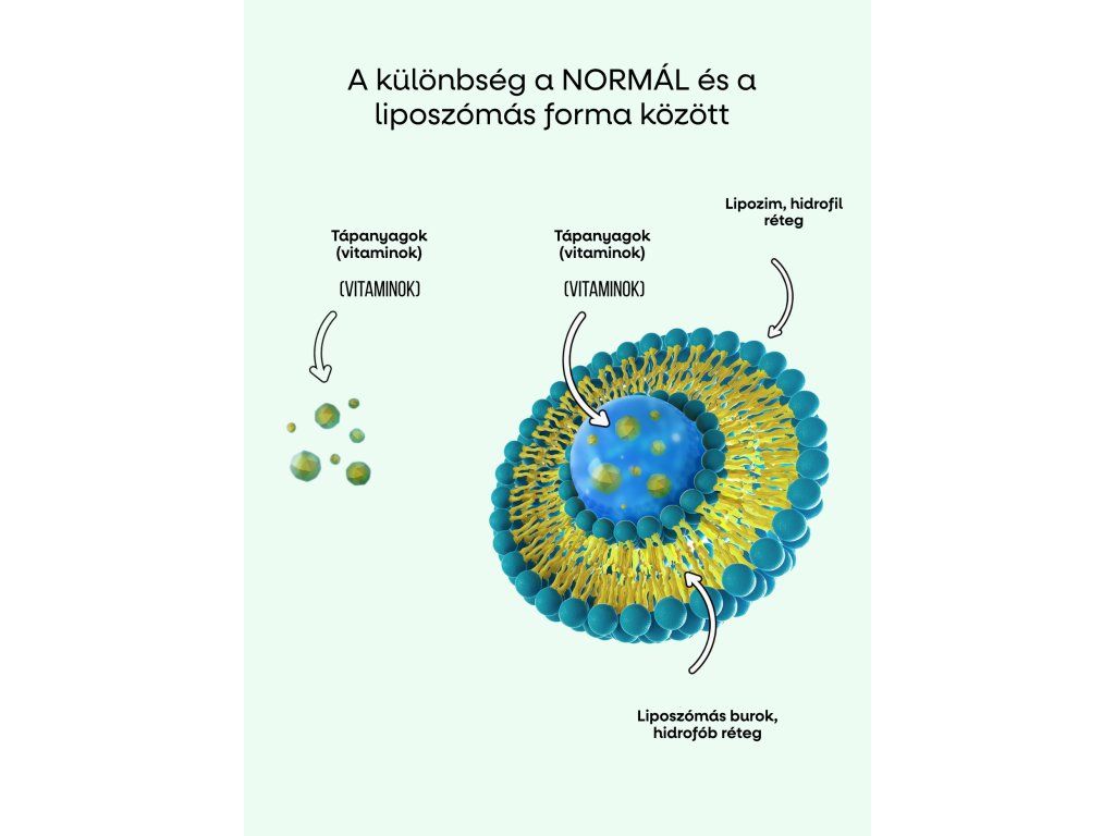 A liposzómák természetes foszfolipidekből állnak, amelyek minden sejtünk alapvető építőkövei, ezért a sejtfalakon keresztül úgynevezett passzív transzporttal teljesen problémamentesen jutnak át. A liposzómák természetesen előfordulnak például a kolosztrumban és az anyatejben, ahol a maximális felszívódás és hasznosulás teljesen elengedhetetlen. Szerkezetüknek köszönhetően a liposzómák védik a vitaminokat az emésztőrendszerben történő lebomlástól, és lehetővé teszik azok közvetlen sejtbe juttatását. Ez a szállítási mód növeli a vitaminok biológiai hozzáférhetőségét, ami azt jelenti, hogy a szervezet több tápanyagot nyer egy-egy adagból a hagyományos étrend-kiegészítő formákhoz képest.
