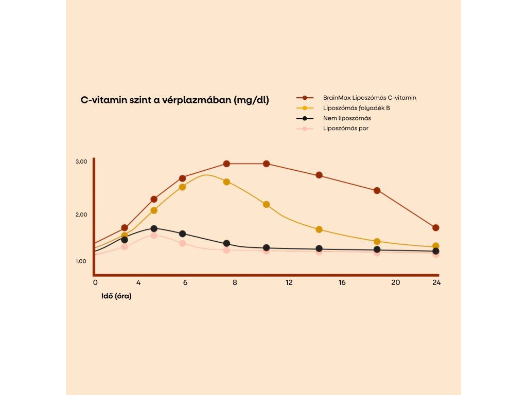 A tanulmány megerősítette, hogy a C-vitamin a mi liposzómás kiegészítőnkben akár 21-szer magasabb biológiai hozzáférhetőséggel rendelkezik, mint a C-vitamin más formái. Az egyedülálló liposzómás technológia révén képes 24 órán keresztül stabil C-vitamin szintet fenntartani a vérben, miközben a porított vagy nem liposzómás formák már néhány óra elteltével visszaesnek az alapértékekre. Más liposzómás termékekhez képest a mi kiegészítőnk majdnem kétszer magasabb felszívódással rendelkezett, ami alátámasztja annak minőségét és hatékonyságát. Tanulmány megtekinthető itt.