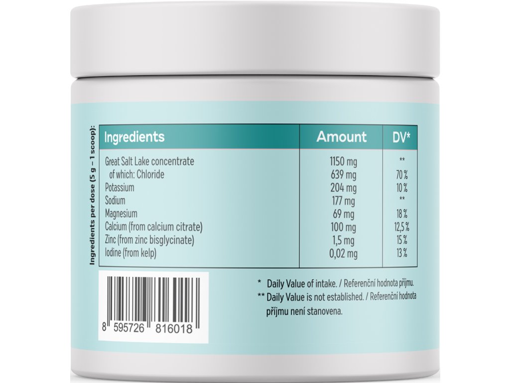 Összetevők: Inulin, Nagy-sóstó-koncentrátum (1150 mg, RHP **), amelyből klorid (639 mg, RHP 70%), kálium (204 mg, RHP 10%), nátrium (177 mg, RHP **), magnézium (69 mg, RHP 18%), természetes aroma, liofilizált málnapor, stabilizátor: citromsav, kalcium (kalcium-citrátként) (100 mg, RHP 12,5%), cink (cink-biszglicinátként) (1,5 mg, RHP 15%), jód (moszatkivonatként - Laminaria japonica Aresch) (0,02 mg, RHP 13%), édesítőszer: fermentációból származó szteviol glikozidok.