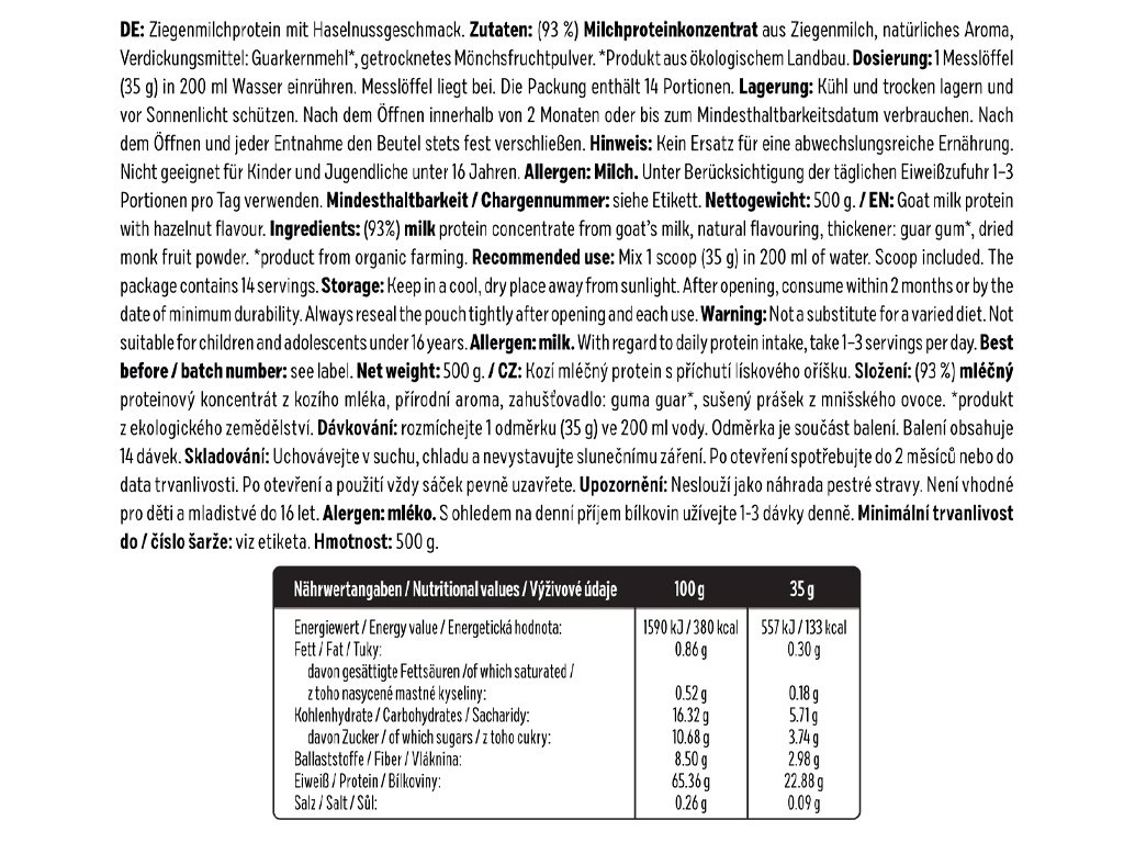 Összetevők: (93%) tejfehérje-koncentrát kecsketejből, természetes aroma, sűrítőszer: guargumi*, szerzetesgyümölcs szárított por. *ökológiai gazdálkodásból származó termék. Allergén: tej.