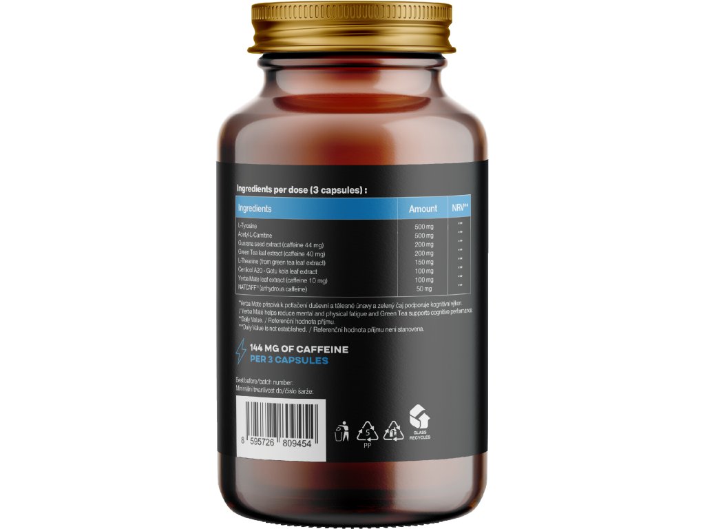 Összetevők: L-tirozin (500 mg, RHP **), acetil-L-karnitin (500 mg, RHP **), guarana mag kivonat (200 mg, ebből koffein 44 mg, RHP *), zöld tea kivonat (200 mg, ebből koffein 40 mg, RHP) * fro tea, RHP * kóla kivonat (Centella asiatica), mint Centicol A20 (100 mg, RHP *), Yerba Mate levél kivonat (100 mg, ebből koffein 10 mg, RHP *), NATCAFF® vízmentes koffein (50 mg, RHP *).