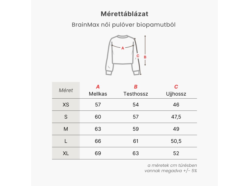 A BrainMax pulóver enyhén karcsúsított női szabással rendelkezik, amely jól áll, és egyben szabad mozgást biztosít. Organikus pamutból készült, 300 GSM magas grammsúlyú anyagból, így megbízhatóan melegít a hűvösebb napokon is. A minőségi kidolgozásnak és a puha belső anyagnak köszönhetően viselheted kint, otthon vagy az edzőteremben. Mi teszi fel a koronát erre? A BrainMarket célja az ökológiai és társadalmi felelősségvállalás – kompromisszumok nélkül, mind neked, mind a bolygónak.