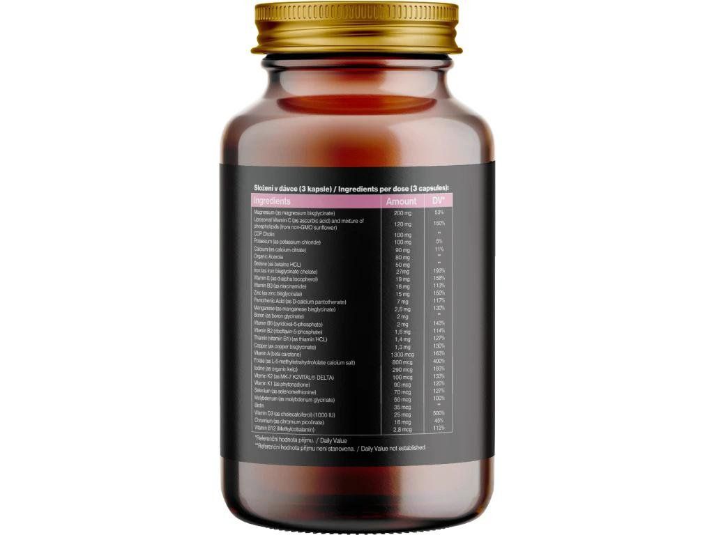 Összetétel: Magnézium-biszglicinát, lipozomális C-vitamin (aszkorbinsav), CDP Kolin, kálium (kálium-kloridként), kalcium (kalcium-citrátként), BIO acerola, betain (betain HCl-ként), vas (vas-biszglicinát kelát), E-vitamin (d-alfa tokoferolként), B3-vitamin (niacinamid), B3-vitamin (niacinamid), cink (cink-biszglicinátból), pantoténsav (D-pantotenát kalciumként), mangán (mangán-biszglicinát), bór (bór-glicinátként), B6-vitamin (piridoxál-5-foszfát), B2-vitamin (riboflavin-5-foszfát), B1-vitamin (tiamin HCl-ként), réz (réz-biszglicinátként), A-vitamin (béta-karotin), folát (L-5-metiltetrahidrofolát kalcium-sóként), jód BIO algából, K2-vitamin (K2VITAL®DELTA MK7-ként), K1-vitamin (fitoenadionként), szelén (szelenometioninként), molibdén (molibdén-glicinát), biotin, D3-vitamin (kolekalciferol), króm (króm-pikolinát), B12-vitamin (metilkobalamin)