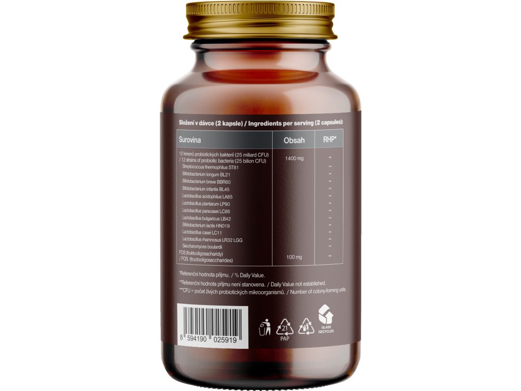 Összetétel: Streptococcus thermophilus, Bifidobacterium longum, Bifidobacterium breve, Bifidobacterium infantis, Lactobacillus acidophillus, Lactobacillus plantarum, Lactobacillus paracasei, Lactobacillus bulgaricus, Bifidobacterium lactis, Lactobacillus casei, Lactobacillus rhamnosus, Saccharomyces boulardii, cikóriarost. Enteroszolvens kapszula. Ballasztanyag-mentes. Vegánok számára is alkalmas.