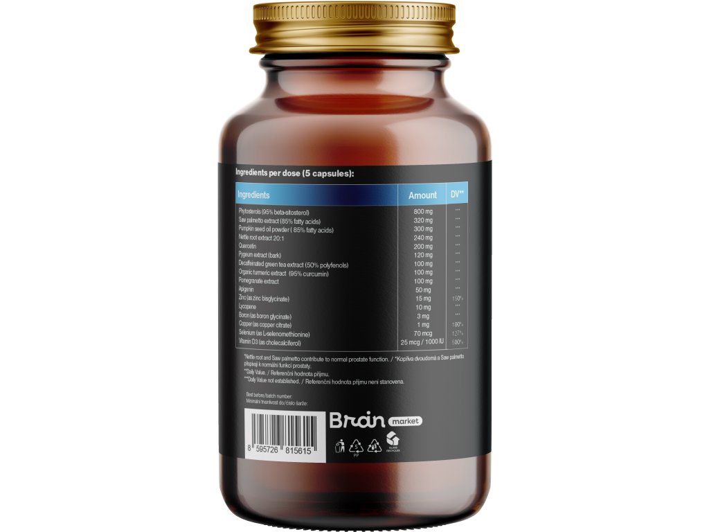 Összetevők: 95%-os béta-szitoszterint tartalmazó fitoszterolok (800 mg, RHP ***), fűrészpálma kivonat (320 mg, RHP ***), tökmagolaj por (300 mg, RHP ***), csalángyökér kivonat 20:1 (240 mg, RHP ***), kvercetin (200 mg, RHP ***), pygeum kivonat (120 mg, RHP ***), koffeinmentes zöld tea kivonat (50% polifenolok) (100 mg, RHP ***), bio kurkuma kivonat (95% kurkumin) (100 mg, RHP ***), gránátalma kivonat (100 mg, RHP ***), apigenin (50 mg, RHP ***), cink (cink-biszglicinátként) (15 mg, RHP 150%), likopin (10 mg, RHP ***), bór (bór-glicinátként) (3 mg, RHP ***), réz (réz-citrátként) (1 mg, RHP 100%), szelén (szelenometioninként) (70 mcg, RHP 127%), D3-vitamin (kolekalciferolként) (25 mcg = 1000 NE, RHP 500%). Stabilizátor és csomósodást gátló anyag: mikrokristályos cellulóz és magnézium-sztearát. HPMC alapú növényi kapszula.