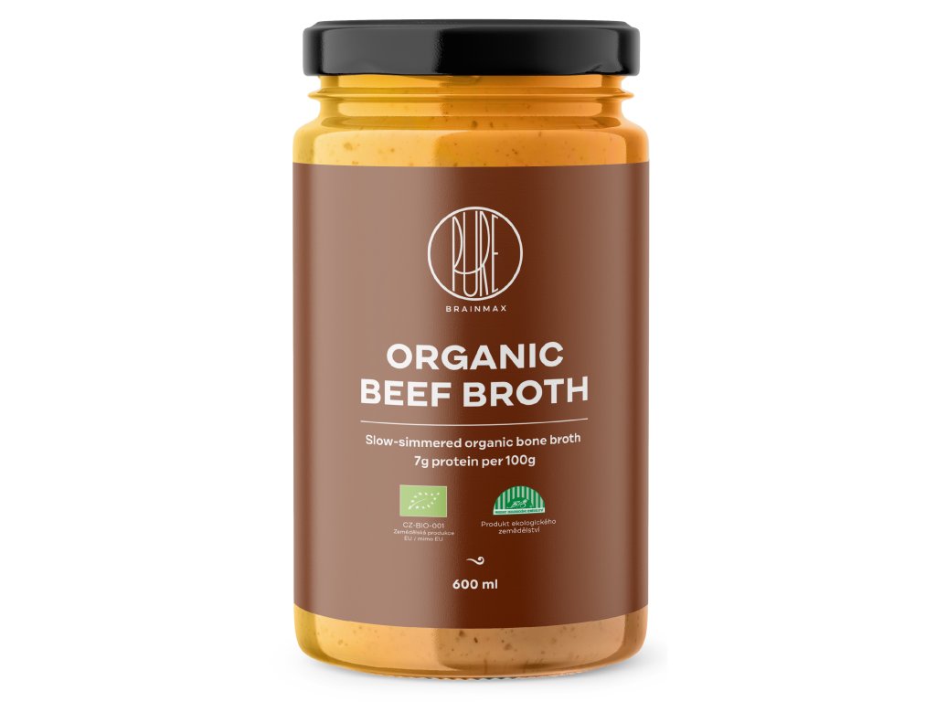 BrainMax Pure marhahúsleves pohárban, BIO, 600 ml Lassan főzött és finomra szűrt marhahúsleves / *CZ-BIO-001 tanúsítvány