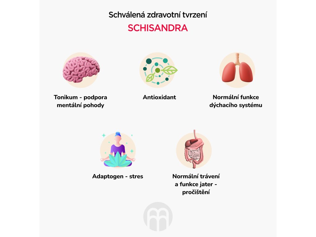 A Schizandra valószínűleg leginkább arról ismert, hogy támogatja a máj egészségét , és segíthet a mellékvese fáradtságában is, ezért alkalmas a fizikai és mentális stressztől szenvedők számára. Emellett támogatja az emésztő- és légzőrendszert , részt vesz a szervezet tisztításában és a máj megfelelő működésében.