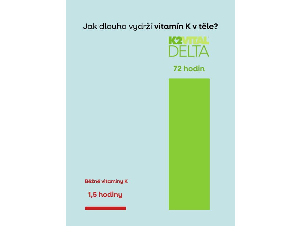 Az MK-7 all-transz formában lévő K2-vitamin stabilabb, mint a hagyományos K-vitamin formák, és lényegesen hosszabb ideig marad a szervezetben – akár 72 órán át is, szemben a többi formánál megfigyelhető 1,5 órával. Ez ideálissá teszi a napi egyszeri adagolásra. A szabadalmaztatott K2VITAL®DELTA forma kettős kapszulázást is tartalmaz, amely biztosítja stabilitását a gyártás során és az emésztőrendszerben.