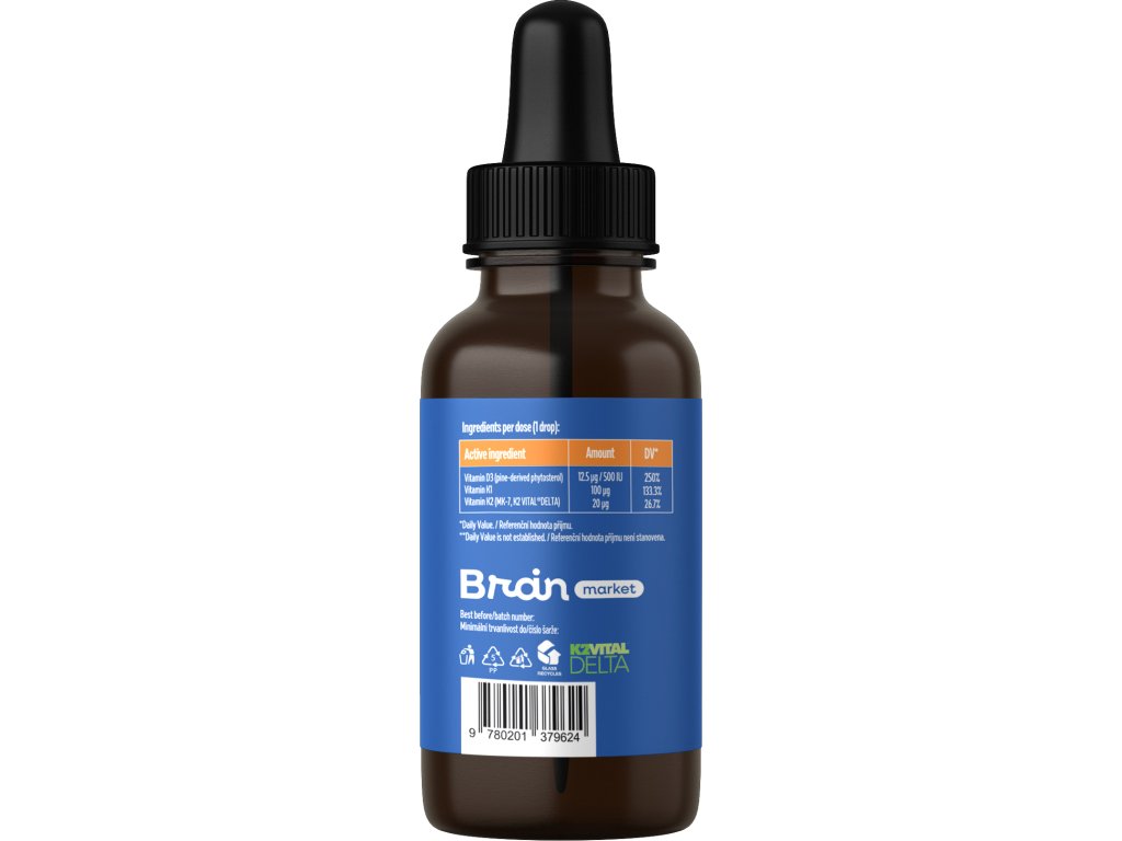 A BrainMax KIDS Vegan Liquid D3 & K2 & K1 egyesíti a gyermek mindennapi fejlődéséhez szükséges kulcsfontosságú vitaminokat. D3 fenyőből, K2 mint MK-7 a szabadalmaztatott K2Vital®Delta formában és K1 tökéletesen kiegyensúlyozott arányban és 100% növényi formában. Egyszerű, minimalista adagolás, maximális minőség és tisztaság, köszönhetően a kókuszból származó MCT olaj alapnak, amely segíti ezen vitaminok felszívódását. Egyetlen csepp naponta biztosítja a minőséget és a biztosítékot, hogy a gyermek szervezete pontosan azt kapja, amire szüksége van.