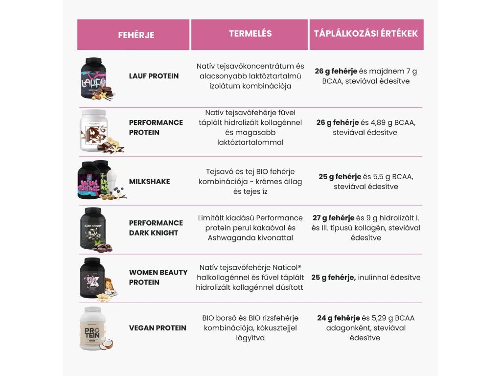 Mind a LAUF, mind a Performance Protein a legjobb minőségű natív fehérjét tartalmaz. Azonban azzal a különbséggel, hogy a LAUF 100%-ban natív fehérjét tartalmaz izolátum és koncentrátum formájában 1:1 arányban. Míg a Performance 62% natív tejsavófehérjét és 26% fűvel táplált kollagént tartalmaz. Ugyanakkor tehénkolosztrummal és kókusztejjel dúsított. A LAUF protein gazdagabb aminosav-spektrumot tartalmaz, különösen a pro-anabolikus leucint, mivel 100%-ban natív tejsavófehérjét tartalmaz. A LAUF protein nem csak a sportteljesítmény és az izomnövekedés érdekében a fehérje kiegészítésére koncentrál, míg a Performance szélesebb körben alkalmazható az immunitás, a bélrendszer, de az edzés terén is.