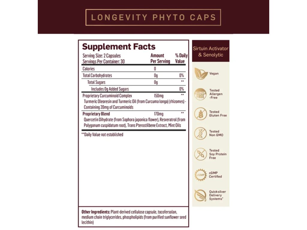 A kutatások azt mutatják, hogy a biológiai öregedést befolyásolhatják a sejtfolyamatok, például a sirtuinok. A Longevity Phyto Caps keverék olyan fitonutrienseket tartalmaz, mint a kurkumin és a rezveratrol , amelyek aktiválhatják a hosszú élettartamot biztosító géneket és elősegítik a sejtek élettartamát. Ezek az összetevők támogatják az egészséges gyulladásos választ és a méregtelenítést is.