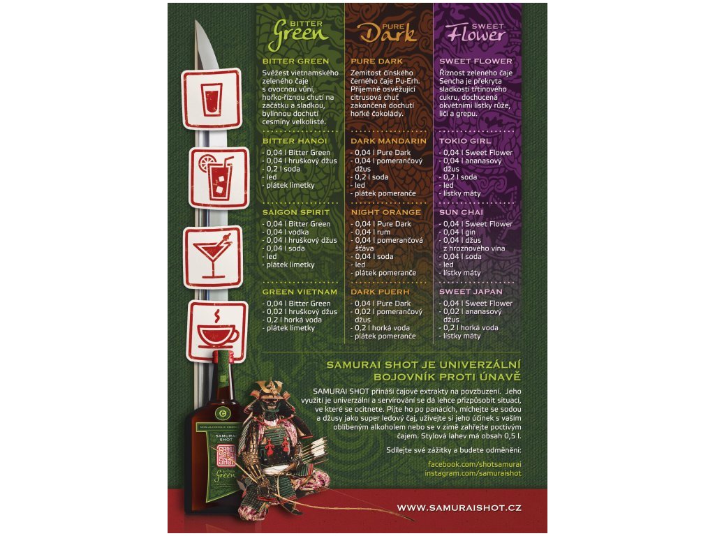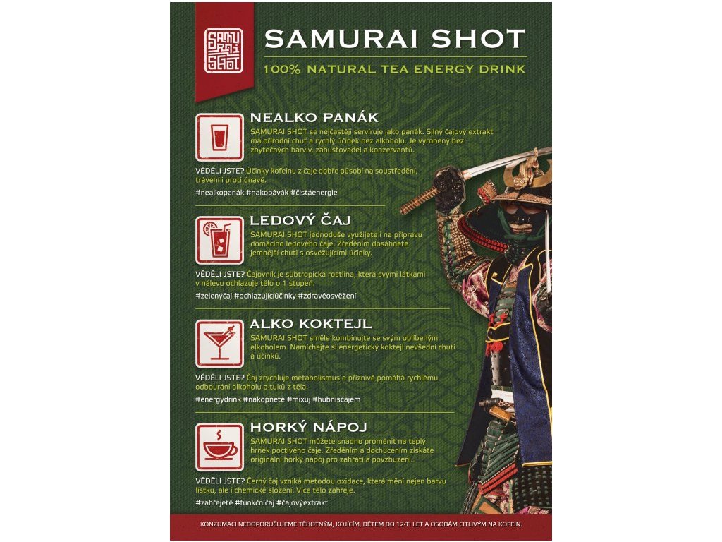 A Samurai Shot ínyencek akkor isznak lövéseket, amikor gyors ösztönzésre van szükségük. Tálalhatjuk nagyszerű jeges teaként is, összekeverhetjük kedvenc alkohollal, vagy felmelegítéshez hígíthatjuk forró vízzel. Az ízesítés a fantáziádon múlik. Használhatja a konyhában ételek, desszertek vagy fagylaltok elkészítéséhez.